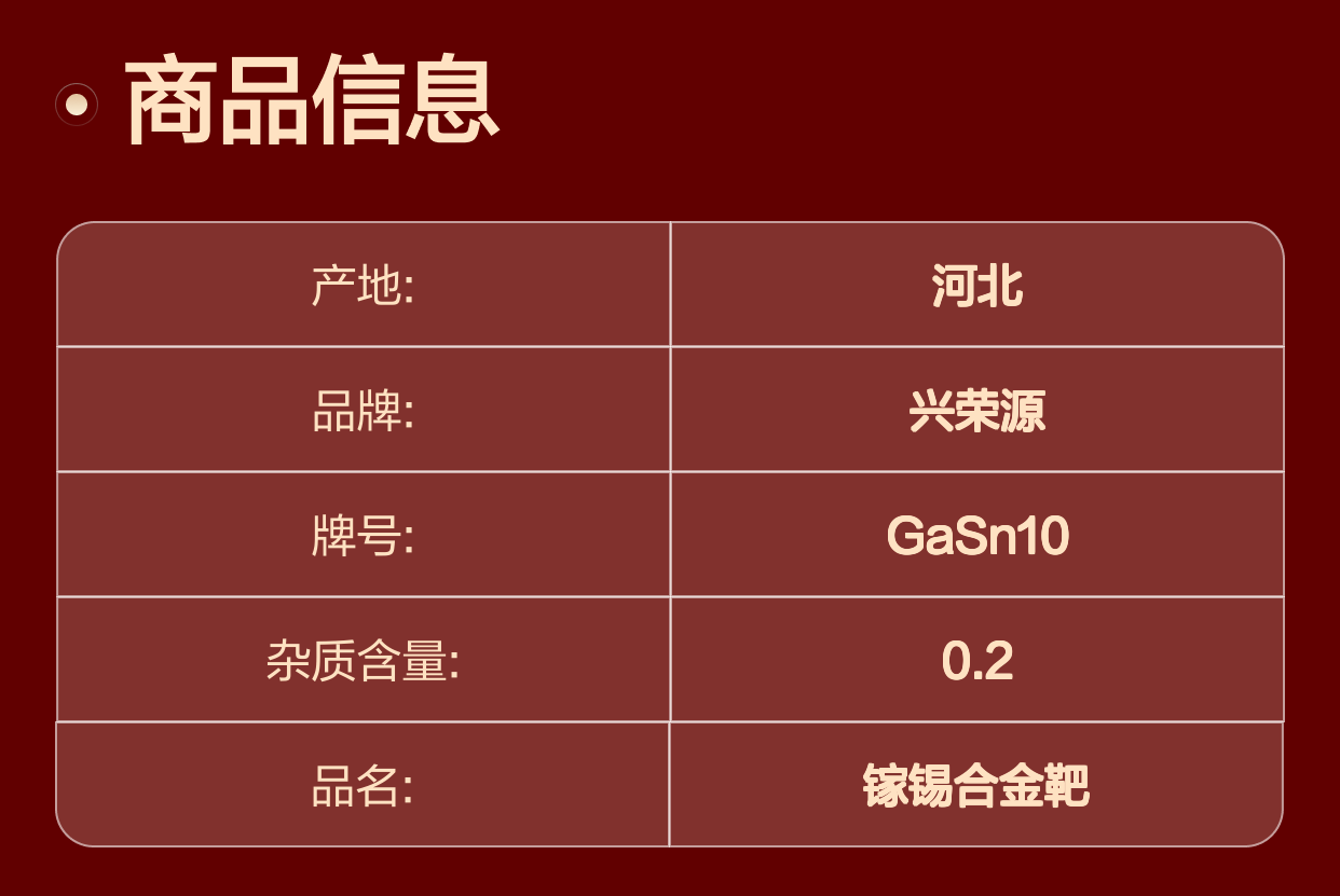 镓锡靶作为透明导电膜制备中的优质材料,特别是GaSn5与GaSn30合金靶,将继续引领高导电热导率薄膜的发展方向。选择北京兴荣源科技有限公司的镓锡合金靶,意味着获得稳定可靠的材料供应和专业技术支持,为您的产品性能提升保驾护航。