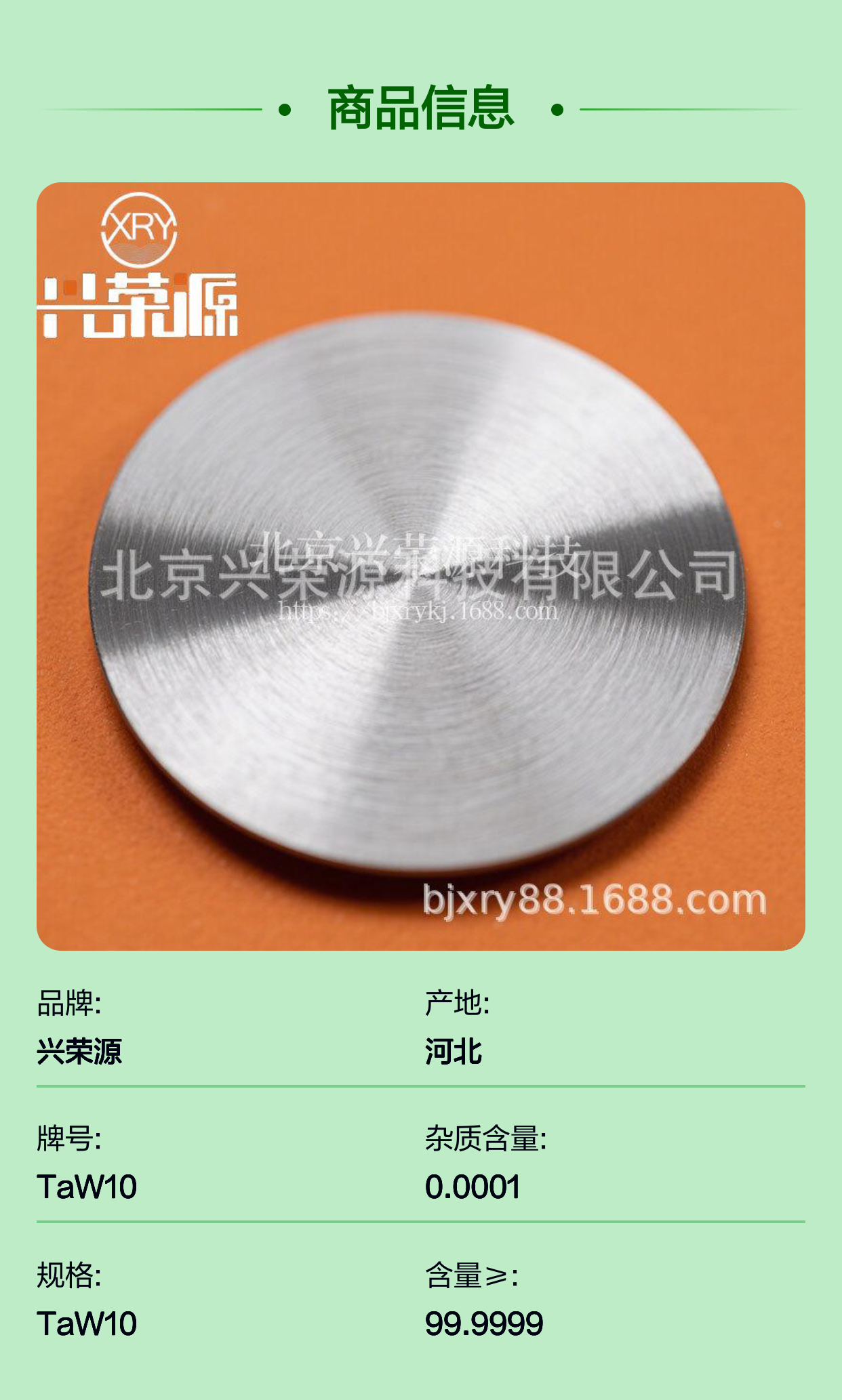 钽钨合金靶作为高性能材料的重要成员,因其卓越的物理化学性质,广泛应用于核能、航天、半导体及电子领域。北京兴荣源科技有限公司专业生产的钽钨合金靶,特别是TaW10和TaW2.5型号,凭借高熔点和优异的耐腐蚀性能,为多行业客户提供了坚实的材料支持。