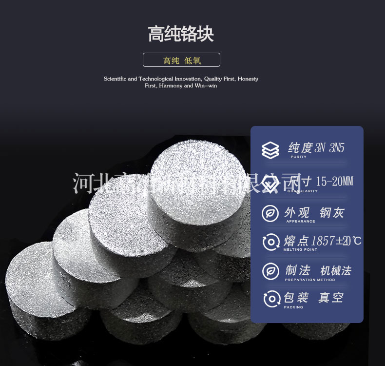 - 电性能稳定:高纯铬的低氧含量减少了材料中的杂质,确保其在电子工业中的导电性能。