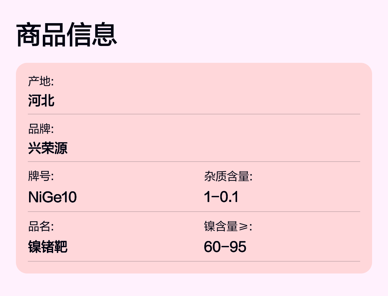建议企业在选购镍锗靶时,结合自身工艺需求、设备兼容性及产品性能目标,选择合适型号的镍锗合金靶,并优先考虑具备技术支撑和品质保障的供应商,如北京兴荣源科技有限公司。