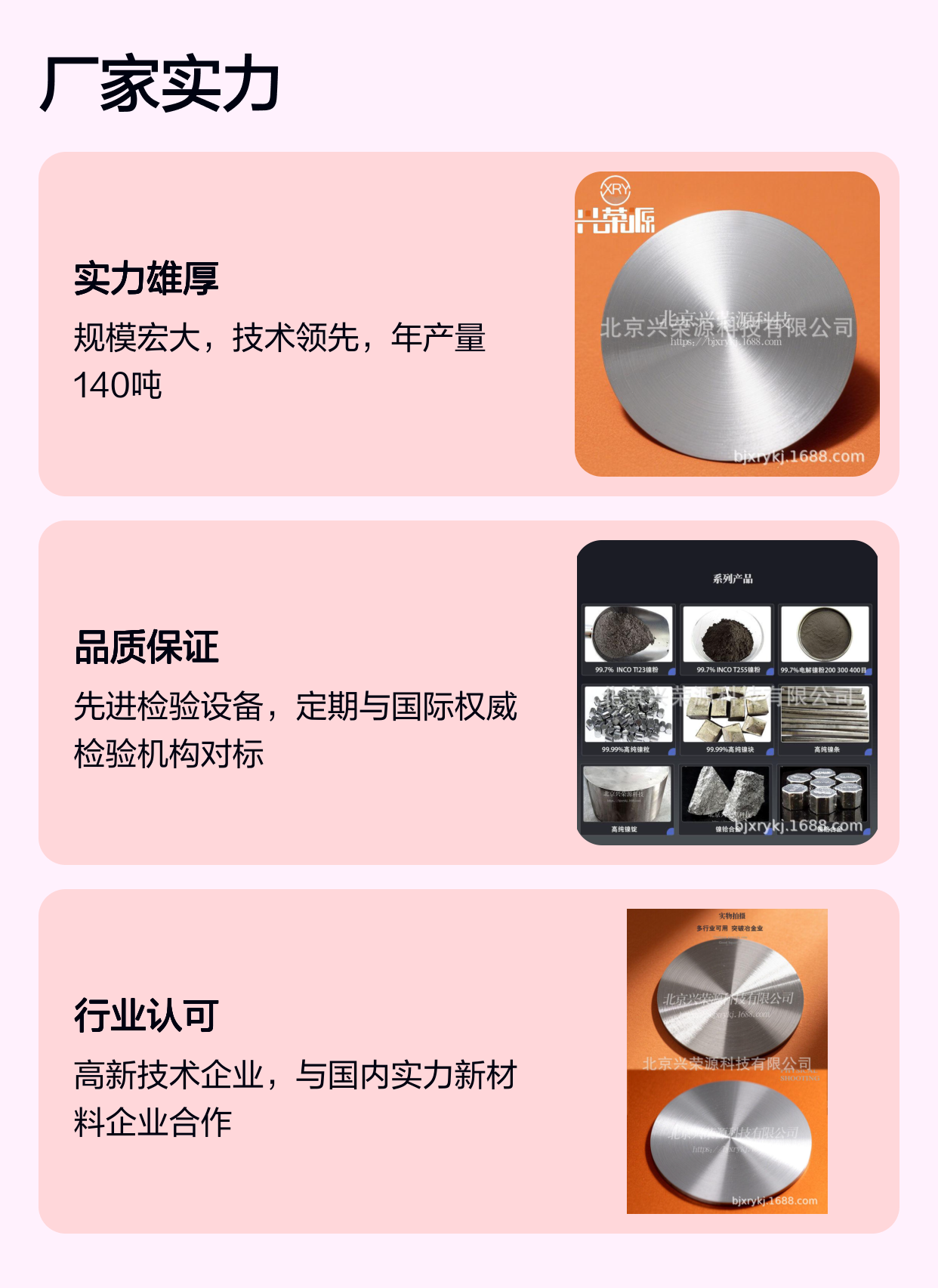 作为国内lingxian的特种合金靶材制造商,北京兴荣源科技有限公司拥有成熟的合金靶冶炼和加工技术。公司专注于镍锗合金靶的研发和生产,能够精准控制NiGe5和NiGe10等多种规格型号的成分分布与物理性能。