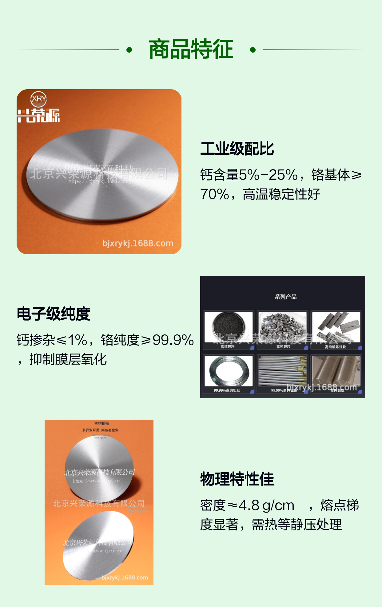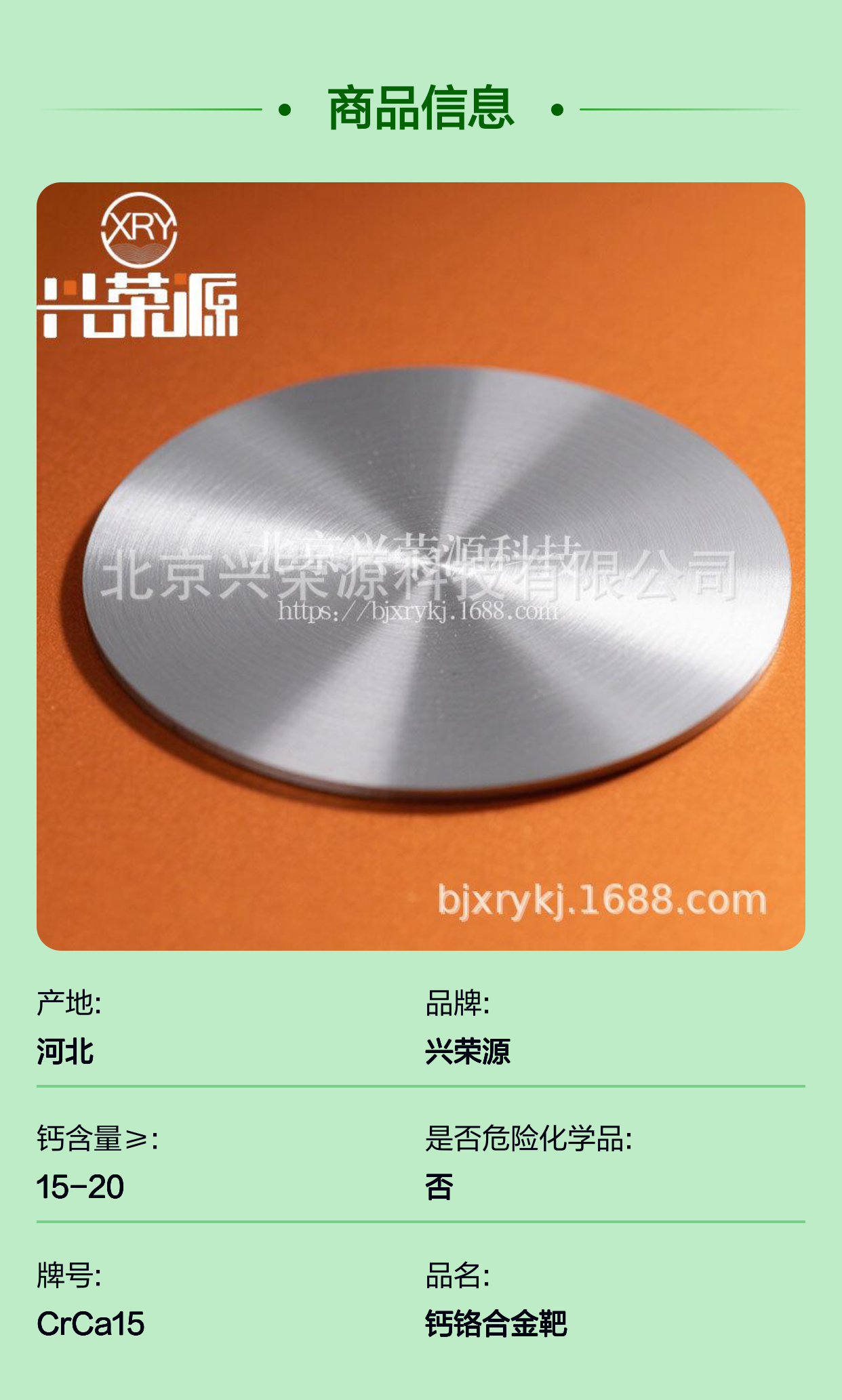 钙铬合金靶作为特种冶金与功能镀膜领域的重要材料,因其独特的物理与化学性能,逐渐成为高温应用中的关键选择。北京兴荣源科技有限公司专业供应的CrCa15与CrCa20两款钙铬合金靶,凭借卓越的品质和稳定的性能,在工业生产中得到了广泛认可。本文将从材料成分、性能特点、应用领域及市场价值多角度探讨CrCa15与CrCa20的优势与潜力。