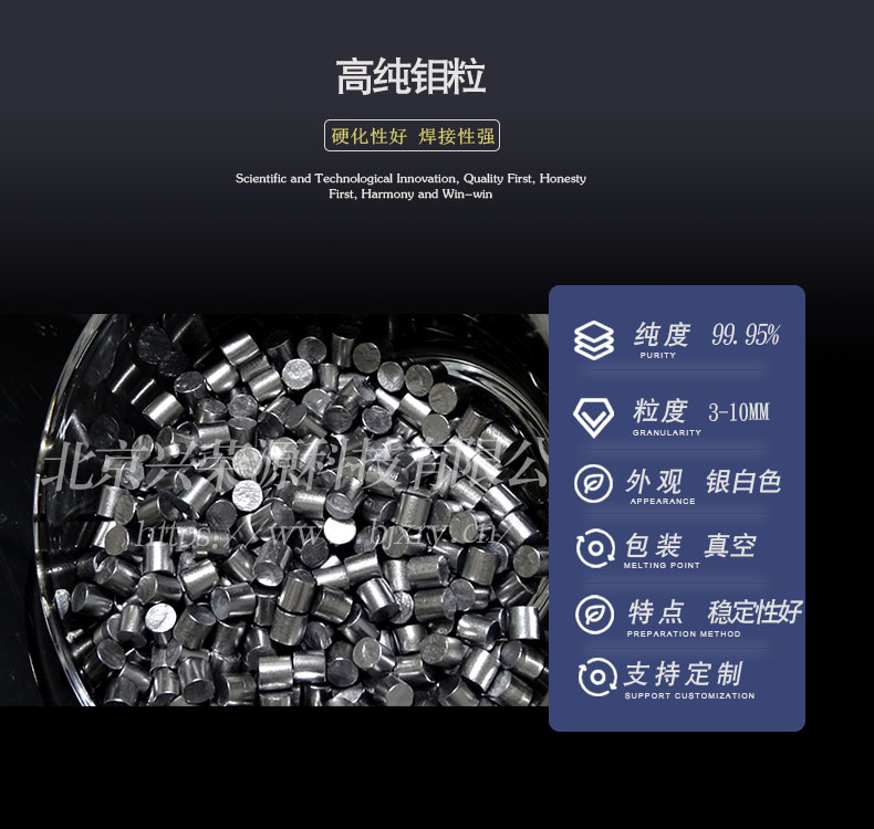 钼粒的质量直接决定其应用效果。北京兴荣源科技有限公司的熔炼钼粒采用先进的高温真空熔炼技术,Zui大限度降低杂质含量,提升金属钼的纯度和均匀性。通过控制炉温和冶炼周期,确保钼颗粒具有稳定的化学性能和优异的机械性能。