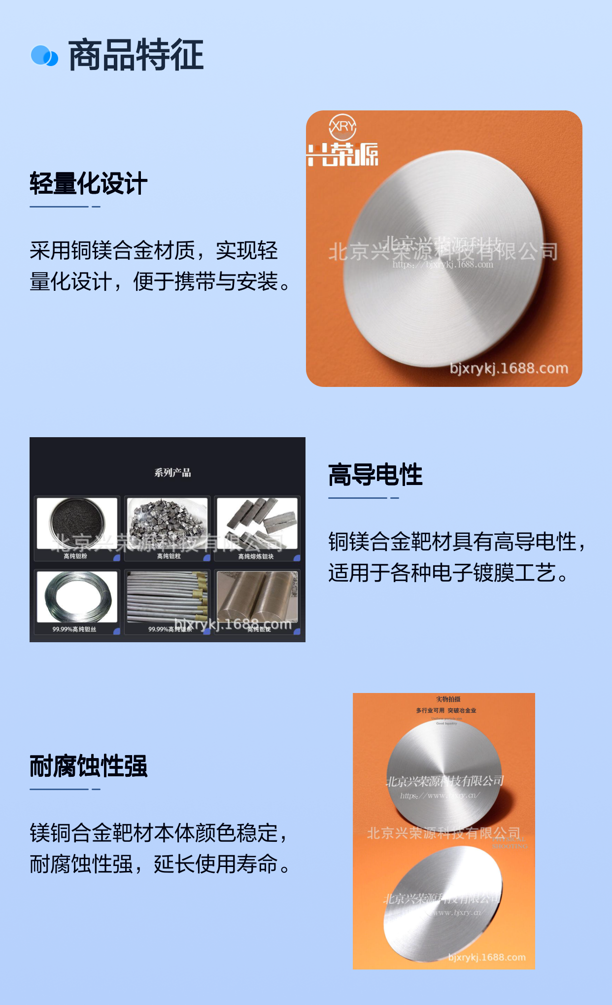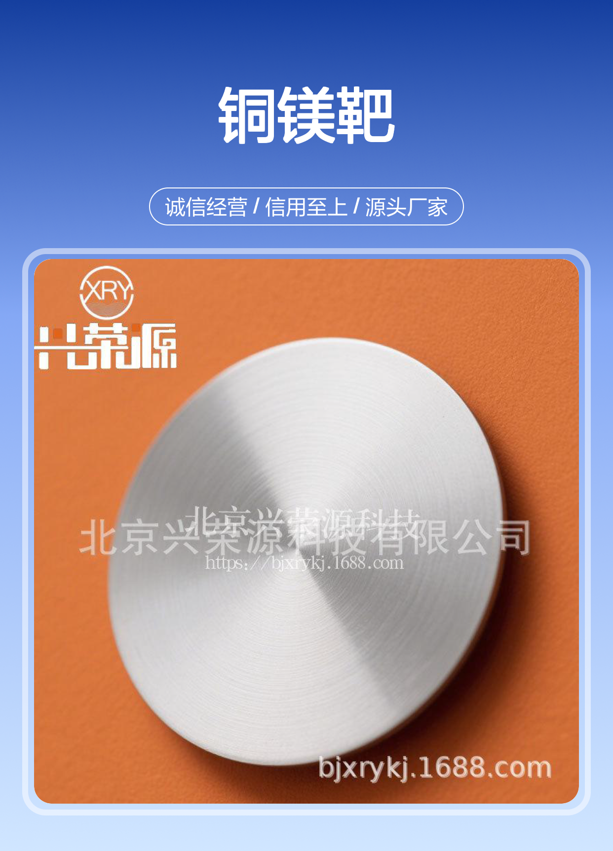 铜镁靶CuMg20和CuMg30代表了铜镁合金靶技术的前沿水平,其轻量化、导电性和耐腐蚀性使其在包括电子制造、生物医学、航空新能源等多个领域具有重要价值。选择北京兴荣源科技有限公司的铜镁靶,不仅获得优质材料,更享有专业技术支持和定制服务,是推动工业升级和创新的理想选择。