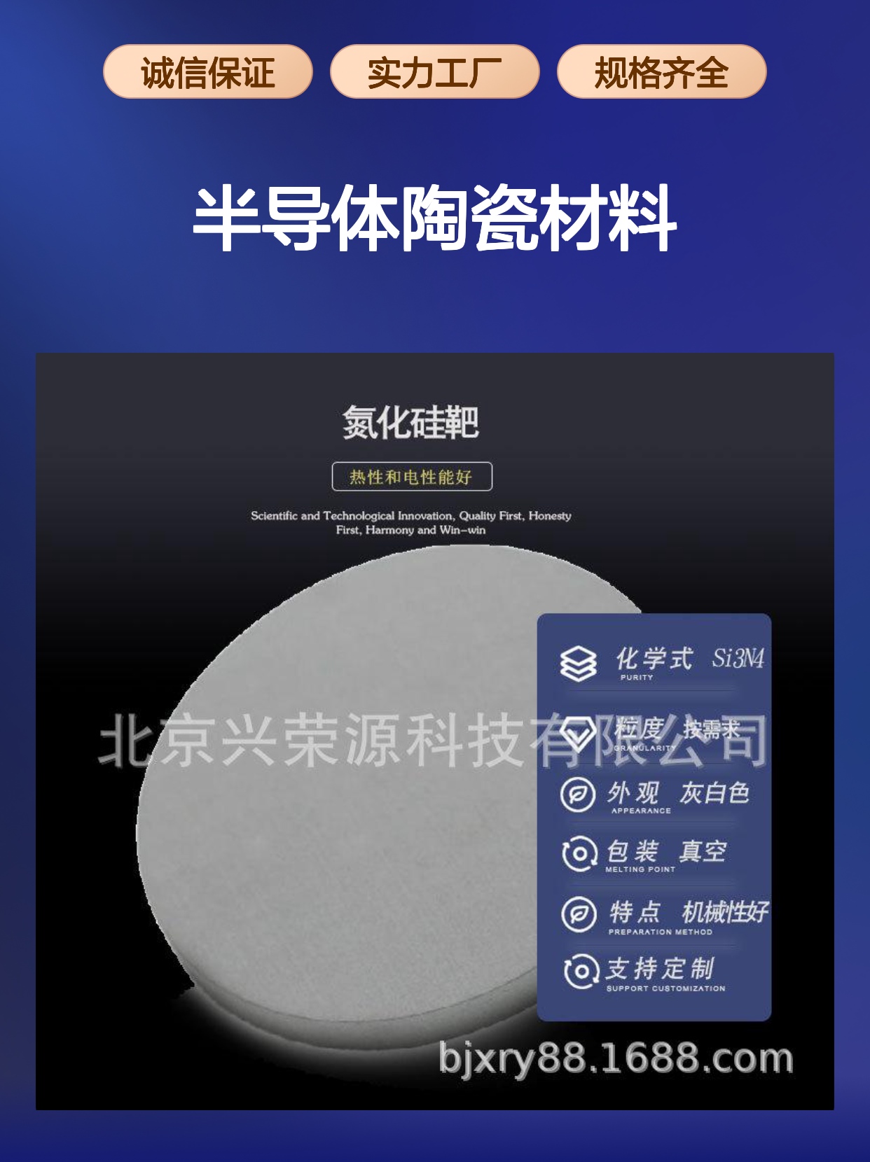 氮化硅靶(Si3N4)作为一种半导体陶瓷材料,因其高硬度和高强度的卓越性能,正逐渐成为电子工业和先进制造领域的重要材料。北京兴荣源科技有限公司专注于氮化硅靶的研发与生产,凭借丰富的技术积累和稳定的产品质量,满足了市场对高性能陶瓷靶材的迫切需求。