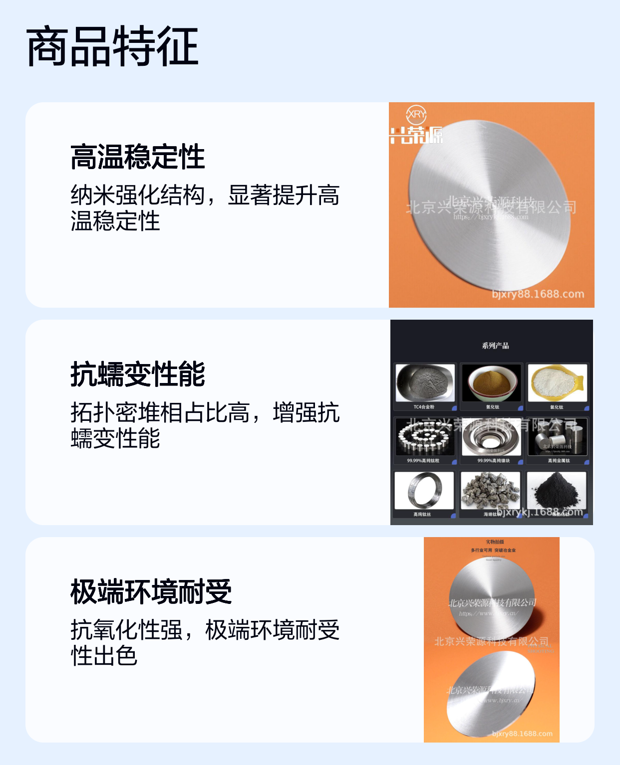 - 晶粒细化技术:北京兴荣源科技有限公司采用特有的粉末冶金工艺,保证靶材结构均匀细密,增强了材料的整体韧性。