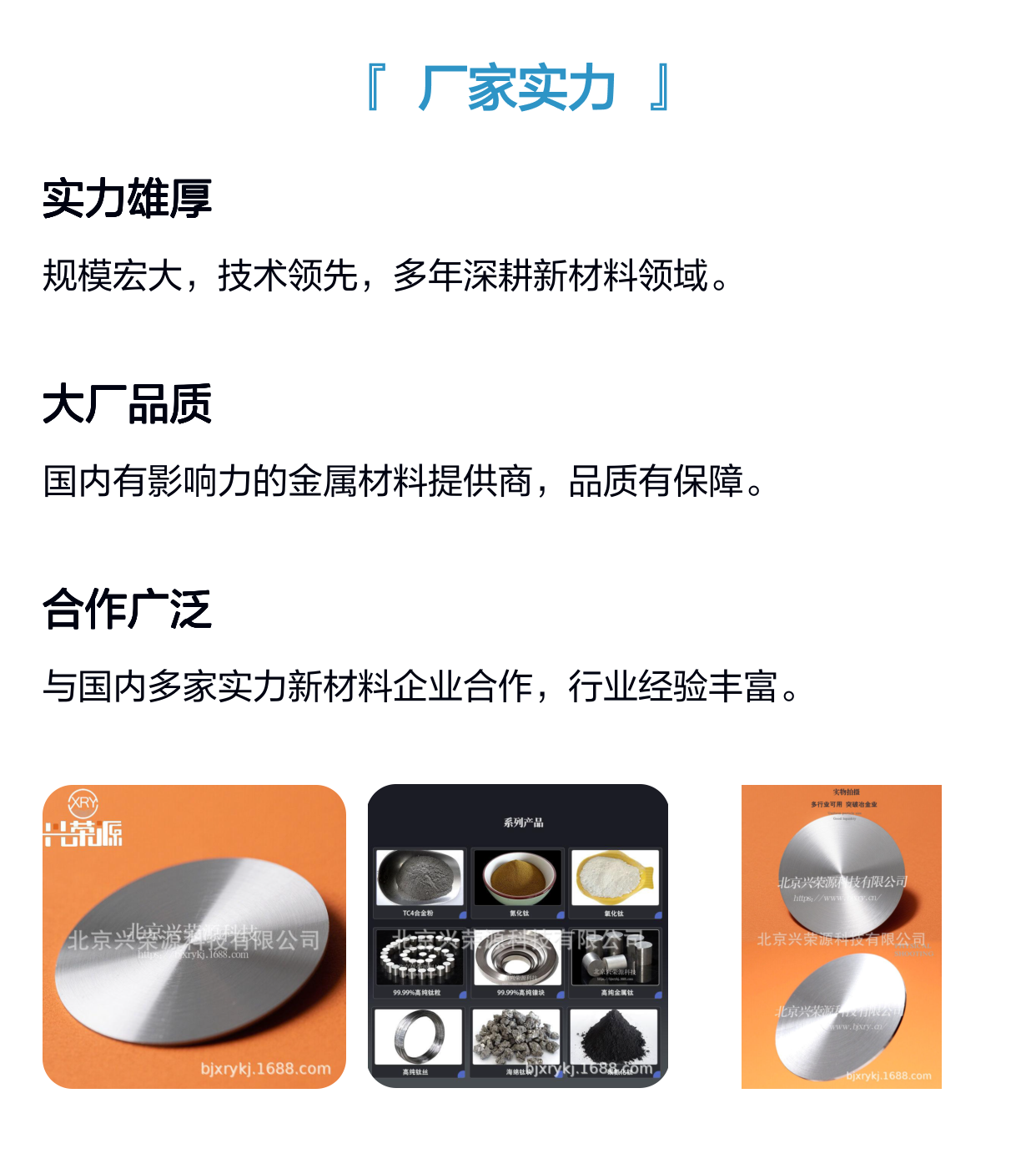 北京兴荣源科技有限公司深耕钇钌合金靶领域,集研发、生产、销售于一体,形成了完备的产业链条。公司不仅掌握了钇钌靶高纯度合成技术,还具备高精度靶材成型工艺,保证产品质量的持续稳定。