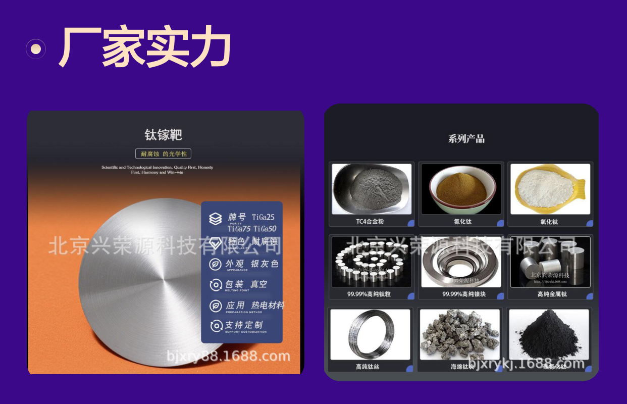 随着柔性显示器、可穿戴设备以及高效光伏器件的普及,对高性能合金靶材的需求持续上涨。钛镓合金靶作为实现高品质薄膜沉积的关键材料,具备广阔市场空间。北京兴荣源科技有限公司凭借在靶材行业长期积累的技术实力和管控体系,保障了TiGa15靶材的稳定供应,帮助客户提升产品性能与竞争力。