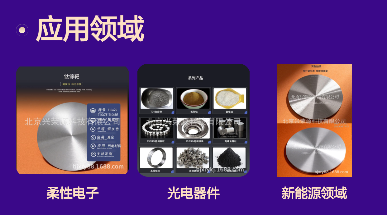 钛镓合金靶作为新兴材料,在电子与光电器件领域展现出独特优势。北京兴荣源科技有限公司推出的钛镓合金靶TiGa15,凭借其银灰色光泽和高纯度品质,成为业内关注的焦点。本文将从钛镓合金靶的材料特性、应用价值、技术优势及市场潜力等多方面,全面解析这款材料的独特之处,帮助相关行业用户深入了解并有效选择合适的钛镓靶产品。