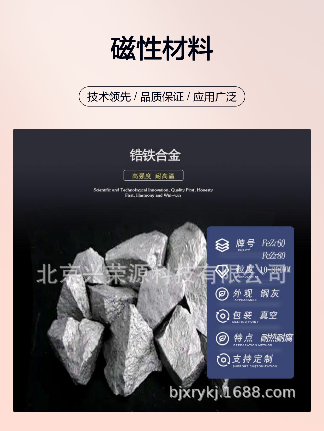 锆铁块FeZr60作为一种关键的铁合金中间合金,在钢铁冶炼和磁性材料领域展现出buketidai的优势。它不仅提升了钢材品质和生产效率,还为磁性材料的创新提供了技术支持。选择北京兴荣源科技有限公司的FeZr60锆铁块,意味着选择品质稳定、性能可靠的合作伙伴。希望更多的企业认识并应用这一youxiu铁合金产品,共同推动产业升级与技术进步。