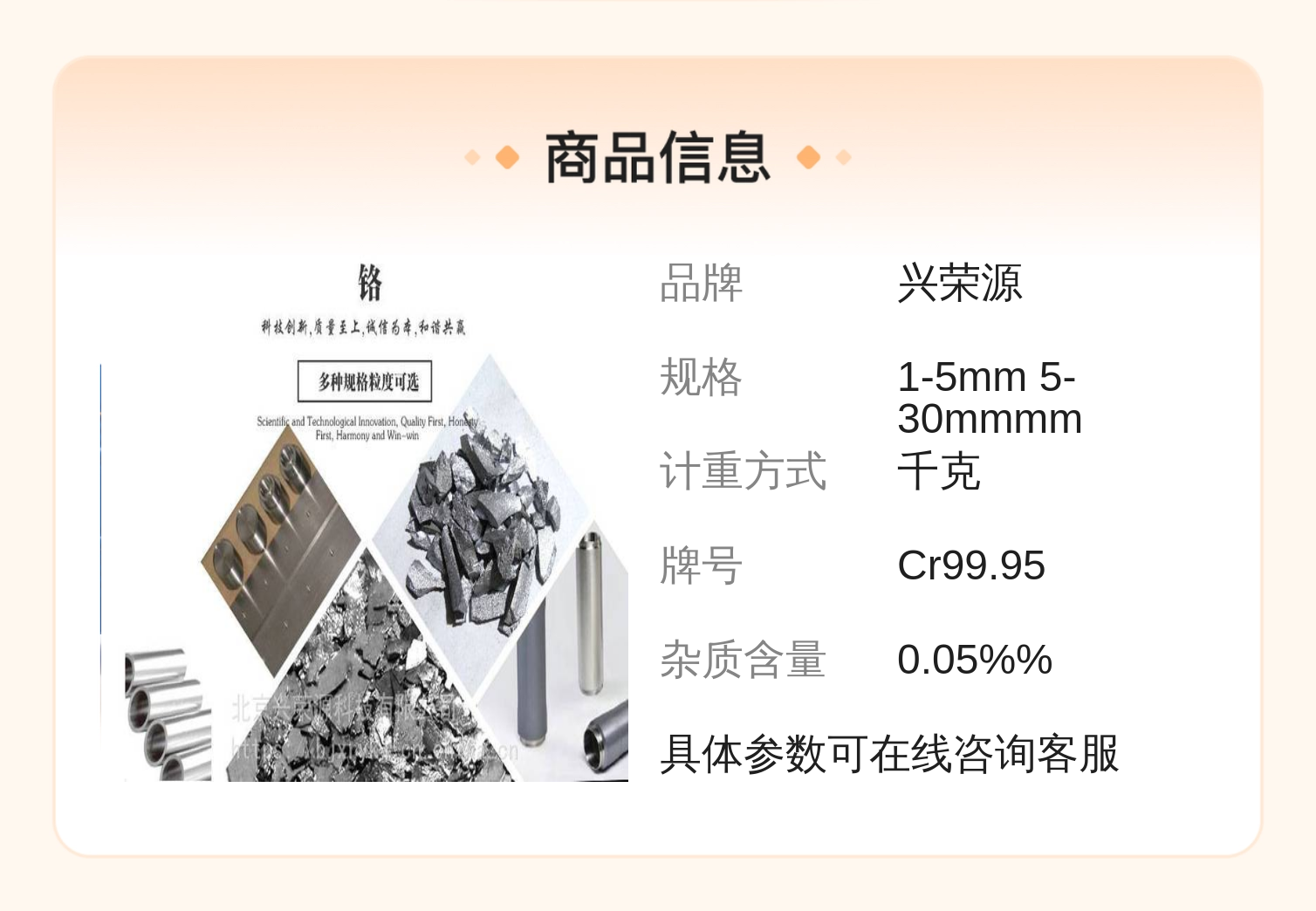 北京兴荣源科技有限公司提供的真空熔炼金属铬铬块,尺寸覆盖1-5mm和5-30mm两主要类型: