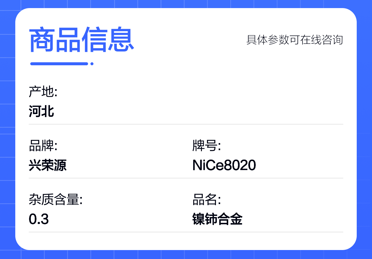 镍铈合金(NiCe合金)是一种以镍为基材,添加一定比例铈元素的中间合金。在这其中,NiCe8020指的是镍与铈的比例约为80%对20%。这种合金结合了镍的耐腐蚀性和铈增强的机械强度,赋予材料更好的综合性能。