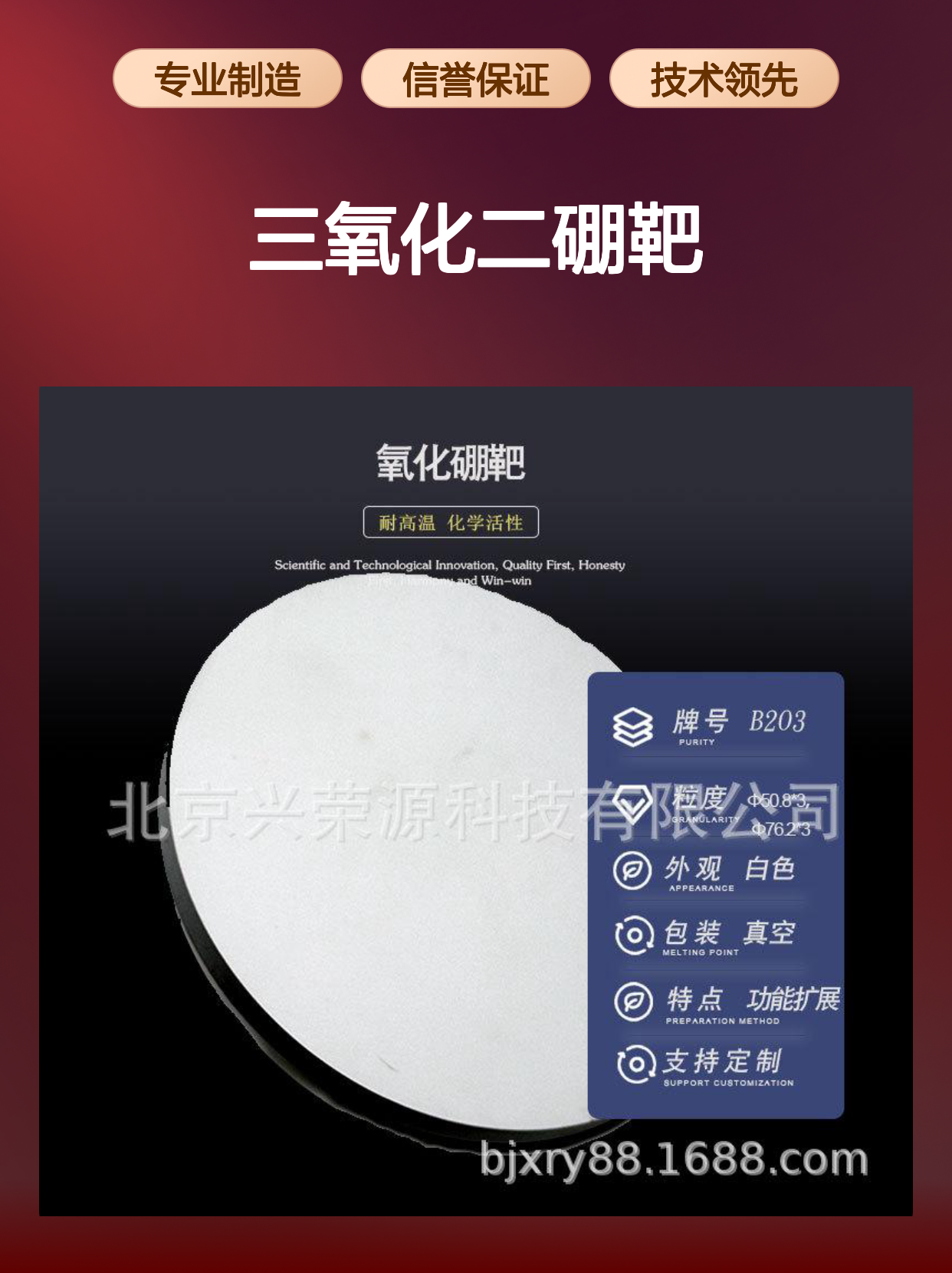 位于首都北京,北京兴荣源科技有限公司结合了科研与产业优势,专注于功能陶瓷靶材的研发和生产。公司长期与多所高校和科研机构合作,不断优化氧化硼靶的制造工艺,确保产品技术lingxian。客户可享受专业技术支持和定制化服务,满足不同应用领域的高标准需求。