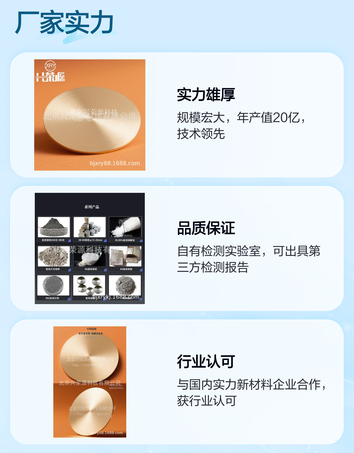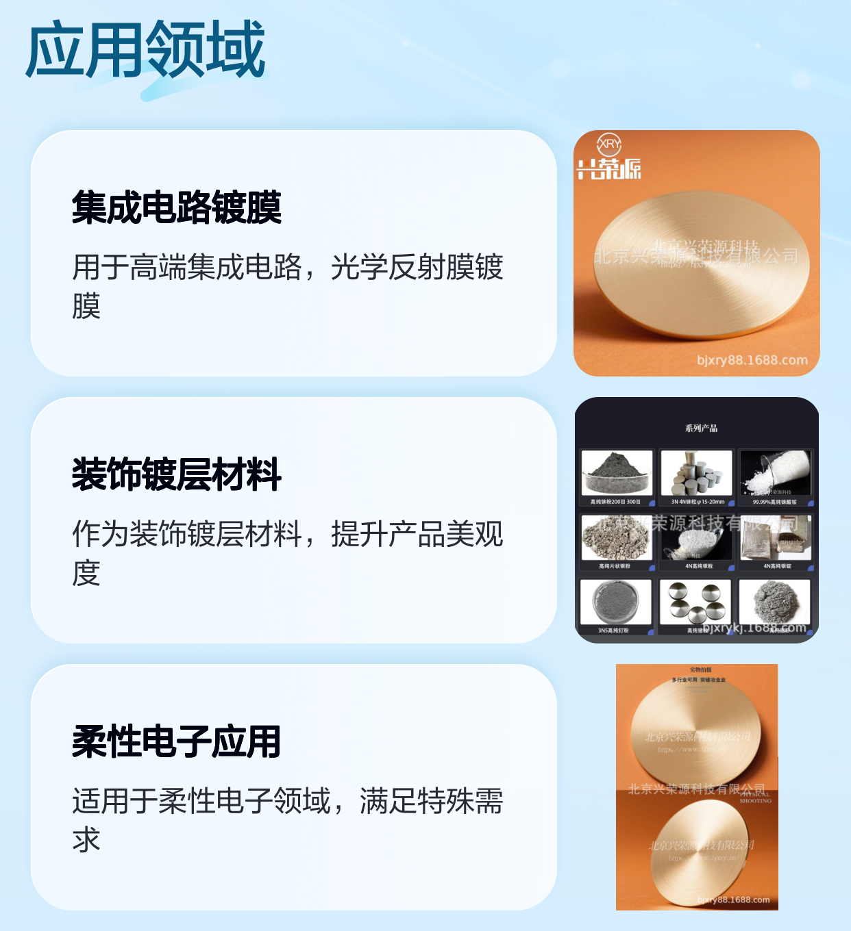 具体应用包括shechi品、智能穿戴设备外壳及高档家居装饰配件。选择北京兴荣源科技有限公司的银金靶,能确保镀膜色泽均匀、附着力强,并且环保无污染,符合现代生产工艺要求。