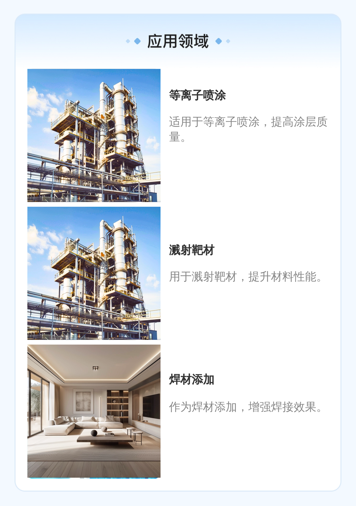 铌粉工业中的应用日益广泛。它主要用于不锈钢及高温合金中,能显著改善金属的强度和耐腐蚀性能。高纯铌粉尤其适合于电子工业,作为超导体、高性能电容器的关键材料。