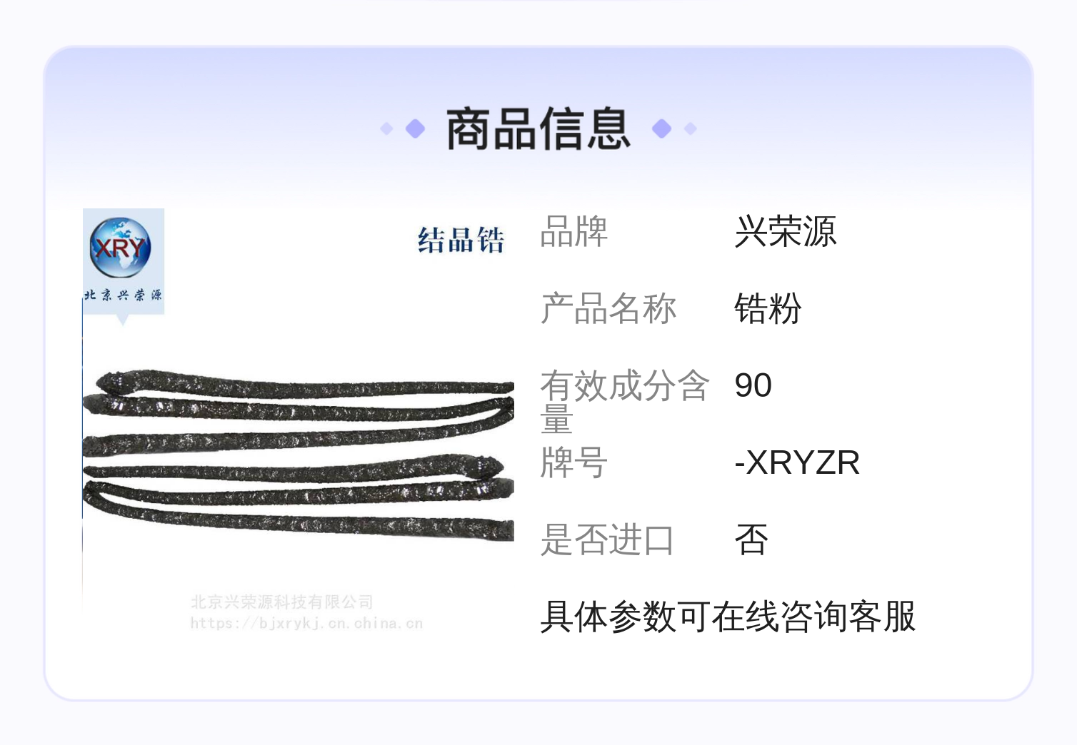 随着材料技术不断进步,氧化锆作为关键的超硬材料,其品质和使用效果决定了下游产品的竞争力。选择北京兴荣源科技有限公司的超细锆粉,不仅是选择一份高品质的材料,更是选择了一份可靠的技术支持和服务保障。无论是制造二氧化锆陶瓷,还是其他高性能应用,氧经锆都将助您提升产品质量,赢取市场优势。