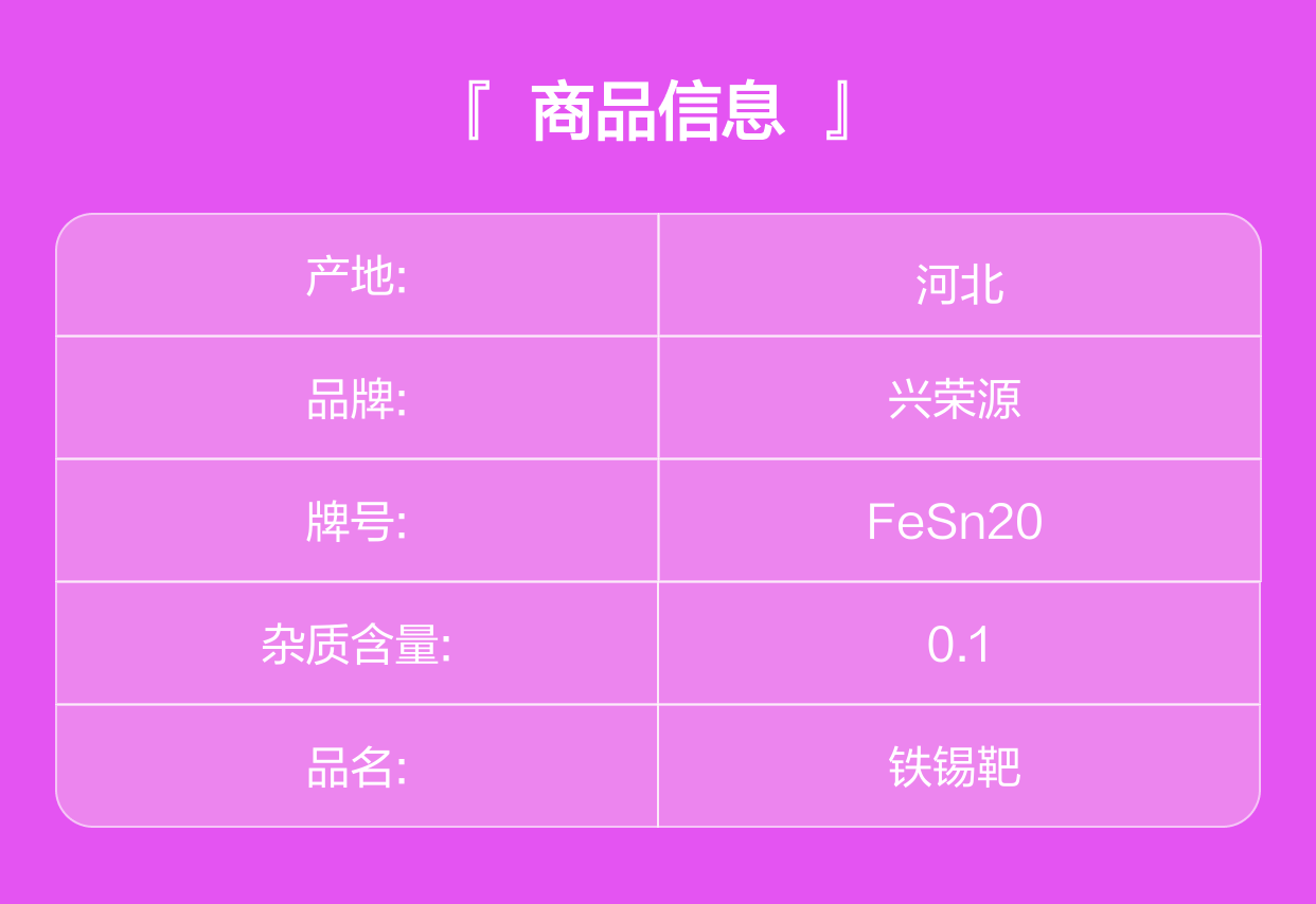 采用铁锡合金靶的优势不只是停留在材料本身,更体现在其对整个制造流程的优化作用。无论是要提升磁记录介质的数据密度,还是要增强电子器件的稳定性和延展性,铁锡靶都是专业领域客户的优选。积极与北京兴荣源科技有限公司合作,获得可靠的材料保障,是迈向产品质量提升的重要一步。