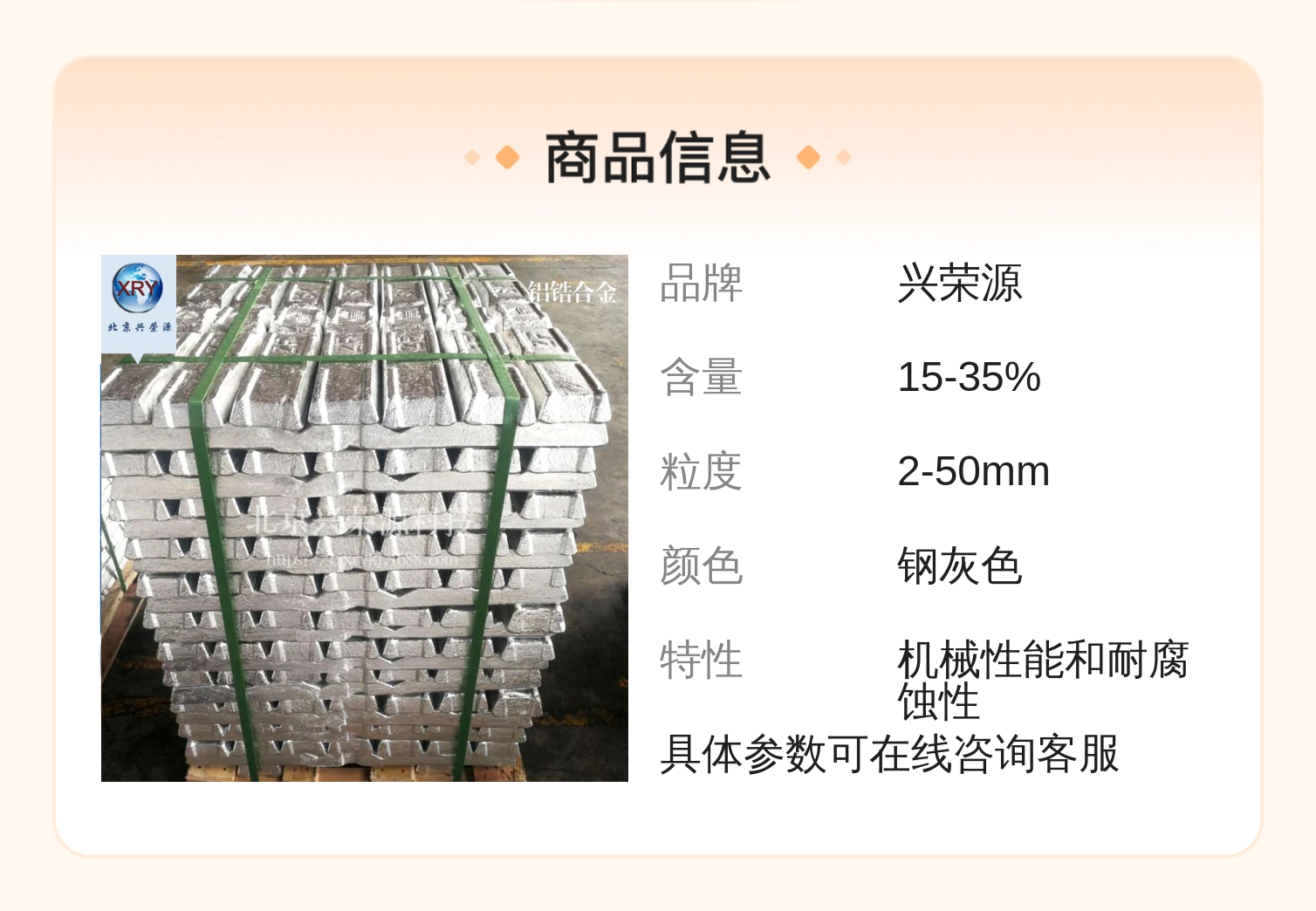 深入理解铝锆合金的性能特点和应用场景,有助于企业在材料选择上做出更科学的决策。北京兴荣源科技有限公司提供的ZrAl8515、ZrAl7525、ZrAl6535等铝基中间合金,不仅性能优异,更具备良好的加工适应性,是您提升产品竞争力的理想选择。欢迎广大客户联系北京兴荣源科技有限公司,共同探索铝锆合金带来的无限可能。