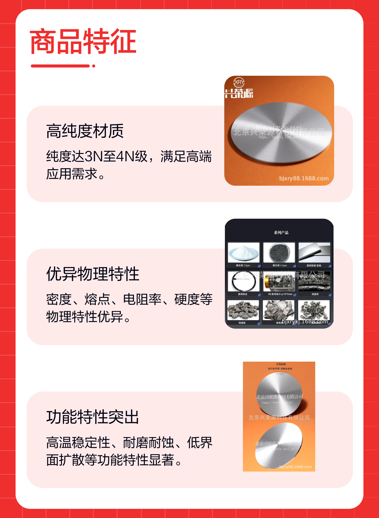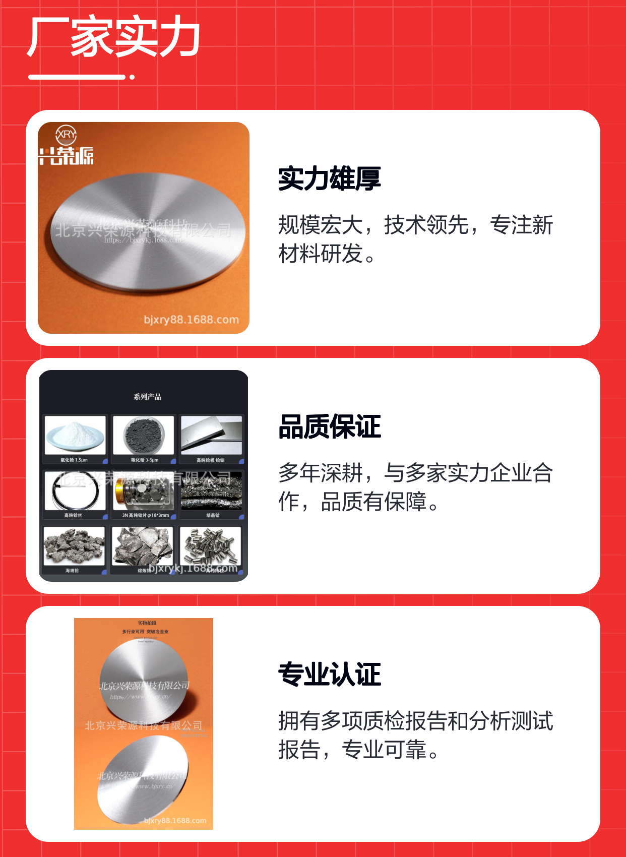 北京兴荣源科技有限公司紧跟行业趋势,不断完善产品配方和生产技术,致力于成为国内铪钒合金靶领域的lingxian供应商。通过稳定的产品质量和优质的客户服务,公司已在多个关键客户群体中获得认可。