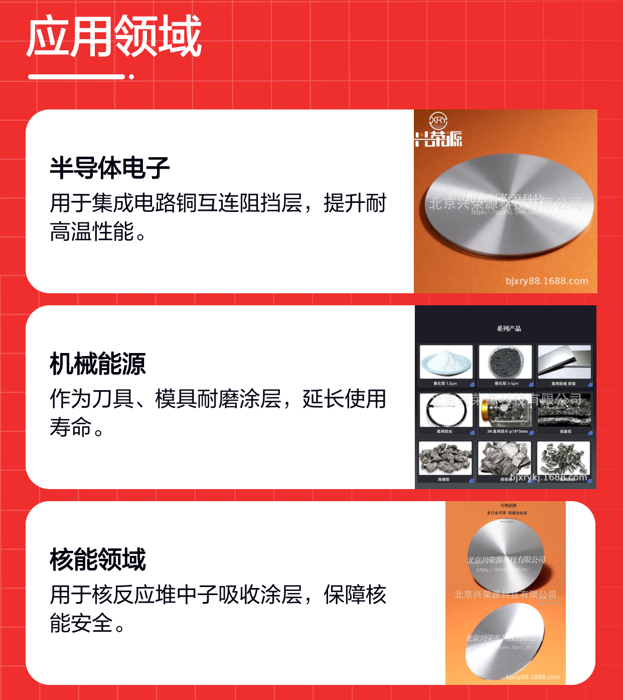 北京兴荣源科技有限公司生产的HfV50和HfV80代表了两种配比的铪钒合金靶,分别意味着钒的含量占50%和80%。不同的比例能够满足多样化的应用需求,比如对材料强度、导电性及热稳定性的不同侧重点。